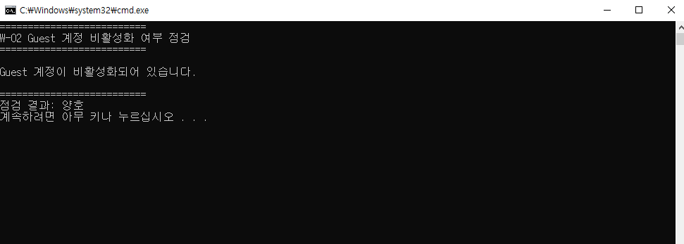 echo 경고: Guest 계정이 활성화되어 있습니다. 비활성화가 필요합니다.