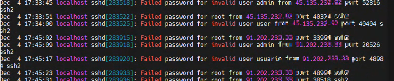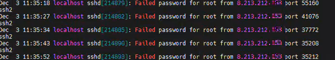 짧은 구간만 보더라도 여러 IP에서 연속적으로 SSH 로그인이 실패하는 것을 확인할 수 있으며,